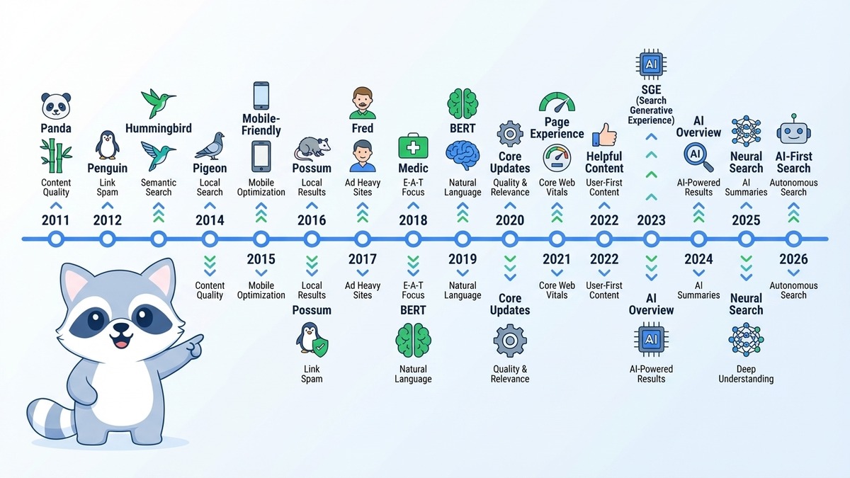 - The 2024-2026 period has been the most disruptive since Penguin, driven by AI-generated content spam and the integration of AI into search results themselves.