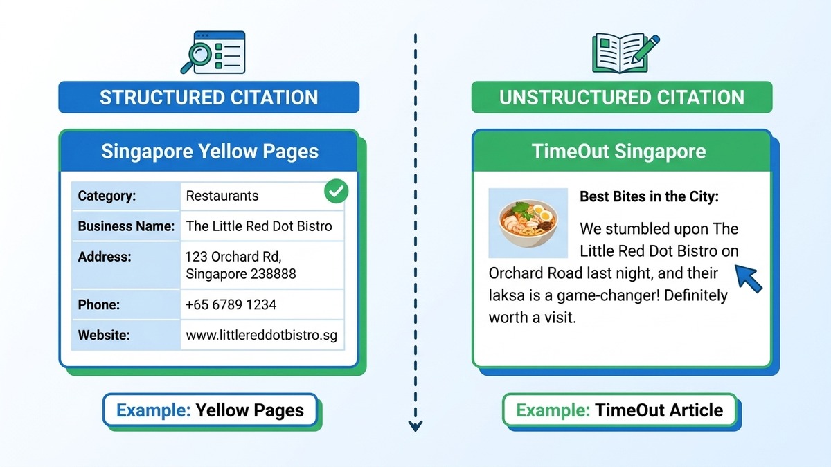 Unstructured citations are mentions of your business in editorial content, blog posts, news articles, or social media. A food blogger writing "I visited ABC Bakery at 12 Jalan Kayu and their kaya toast is incredible" is an unstructured citation. These carry strong trust signals, especially from high-authority Singapore media.